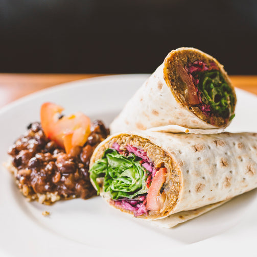 Our blend of Millet & Quinoa, sweet & spicy coleslaw, lettuce, tomato, onion, potato salad and vegan mayo. Comes with Beans & Brown Rice -or- for an additional charge choose Spicy Fries or Cup of Soup.