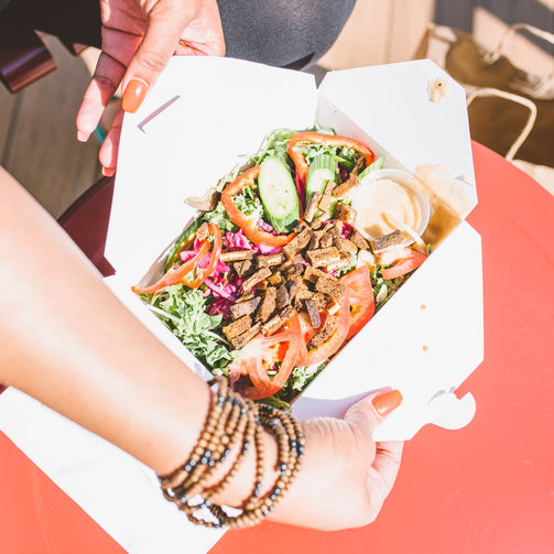 Our In-House Smoked Tofu with mixed greens, sweet & spicy coleslaw, tomato, onion, veggies (ask about the veggies) and vegan mayo & miso dressing.